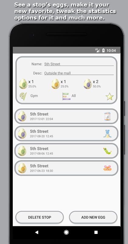 Use Egg Tracker to register what kind of eggs you receive and where you got them, as well as what they hatched into. Egg Tracker provides you with numerous statistics to show you which stops gave you the most purple eggs, how many eggs you received of each type over time (last weeks/months/etc), and more.