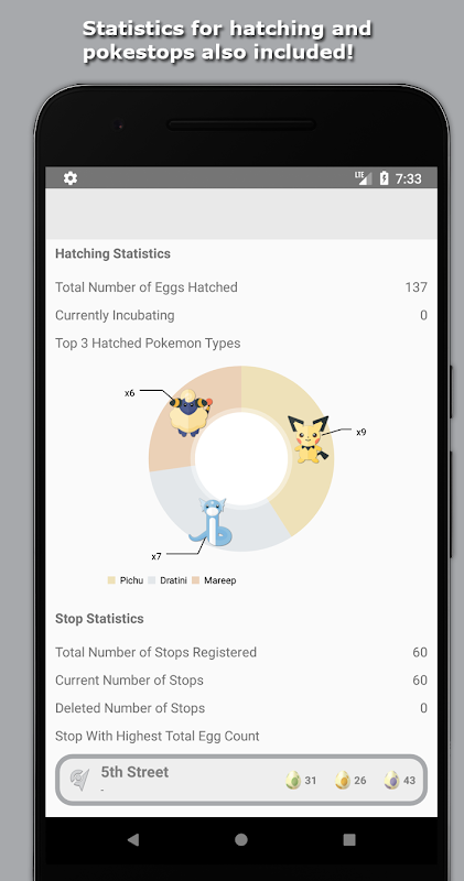 Please note: this application does NOT connect to the Pokemon GO servers and is 100% SAFE to use. It is the equivalent of using pen and paper to keep track of which eggs you have received (but with better handwriting and nicer graphs!).