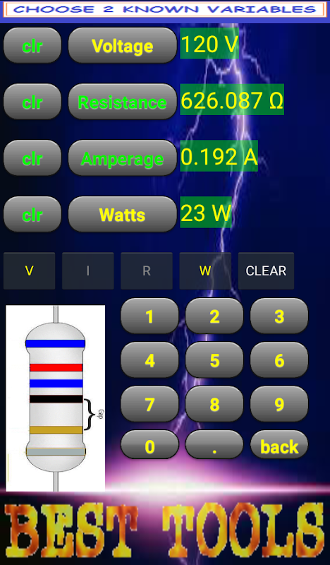 This new version include a (six band) resistor color codes that is interactively changing when you enter data representing the numerical value, you could use it to find the codes or a resistor value ex. like 12500 ohms, you just write in the resistance field and you will see changing the color bands in the resistor while you are typing, another great feature is the reversive way of finding a value or a resistor, when you tap the resistor image, a window will appear where you can set the color to each band of the resistor and you will see at the bottom the value of it. If you have a resistor of 5 bands of 4 you have to ignore the last ones, the one that represent the value are the four after the gap.