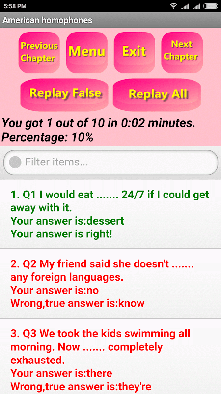 Replay False to try again on only false questions.