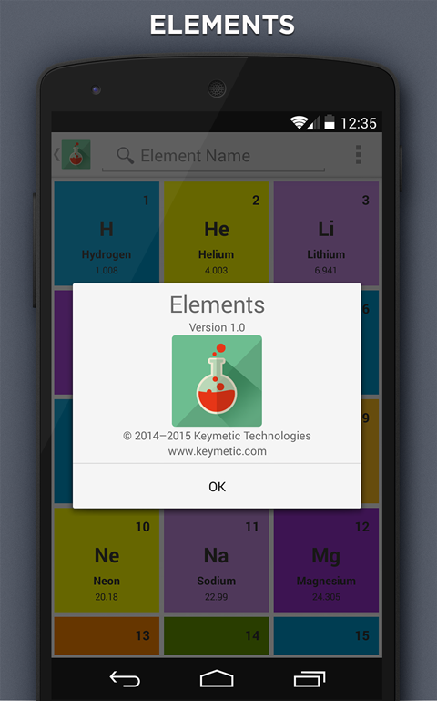 The Elements app contains detailed chemical and physical information of all chemical elements. The app comes with with dynamic layouts showing names, electrons, oxidation, trend visualization, orbitals, isotopes, search with element name etc.