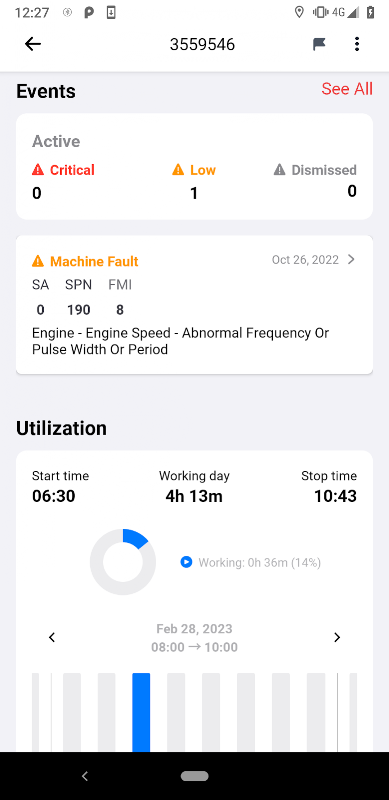 ELEVATE Go 不仅为您提供车队中所有资产的完整概览,还为您提供机器事件,如计划服务、机器故障、问题或警报。