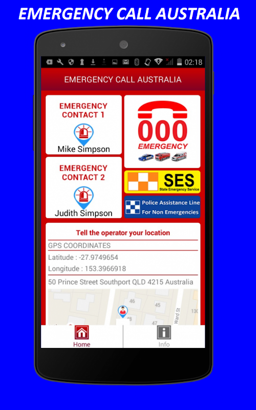 ★ Once the user has completed the call to Triple-Zero (000), State Emergency Service (SES) or Police Non-Emergency the app has the added benefit (if you wish to use it) of transmitting a Text message to two saved emergency contacts advising them that an Emergency call has been made including the address, longitude and latitude.