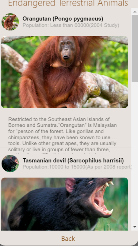 这个应用程序是关于濒临灭绝的动物,你可以看到濒临灭绝的陆生动物,濒临灭绝的水生动物和濒临灭绝的鸟类。