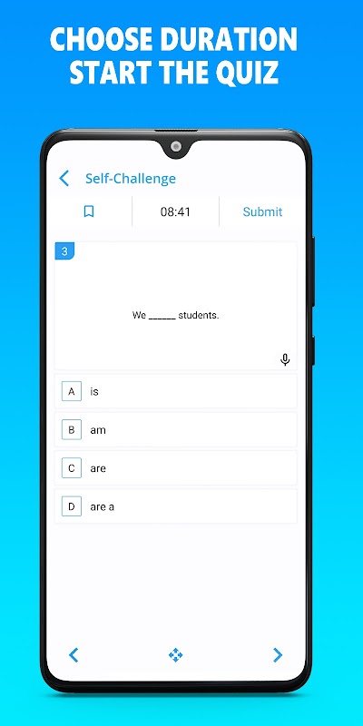 One of the important features of this quiz application is that you can select your English level and start the quiz to practice your grammar. In the quiz, you are asked several questions and are required to select the correct answer from a list of 5 possible options. Test quiz gives 60 seconds for each question but you have a chance to extend the time, pass the question, use a 50/50 chance and ask the correct answer from the audience. At the end of the quiz, you can review your answers and work on your mistakes.
