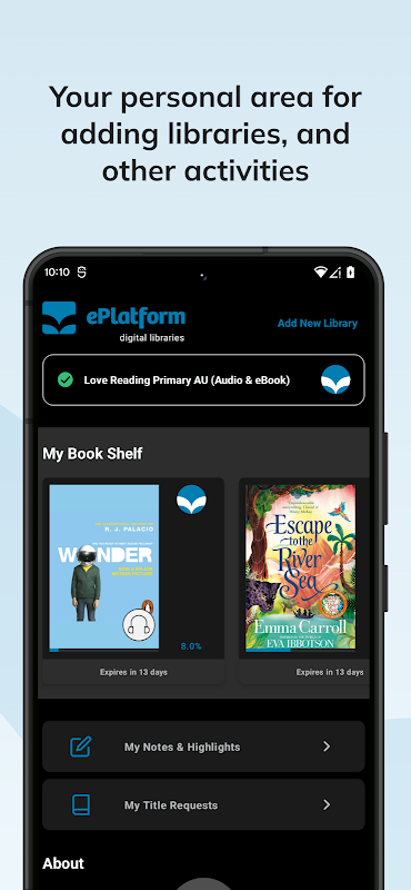 ePlatform 应用程序让学生和顾客只需轻按一下按钮即可访问电子书和有声读物收藏。随时随地开始阅读和收听。 ePlatform 针对智能手机和平板电脑进行了优化,因此您可以随身携带图书馆。