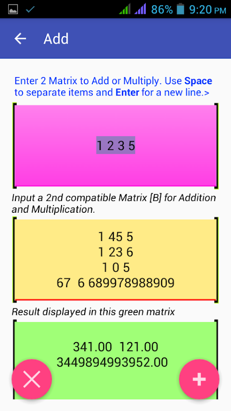 计算的大小仅受您手机的处理器和内存大小的限制。任何尺寸矩阵和任意数量的未知变量的线性方程的变量。