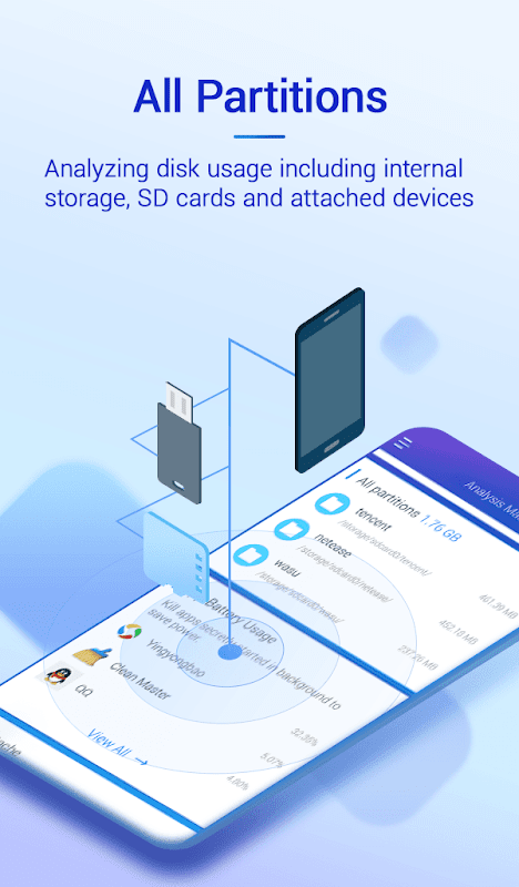 It scans the storage space available on your device including internal storage, SD cards, all On-The-Go and attached devices, presenting the total and used space on each. All storage detail could be viewed in ES Disk Analyzer.
