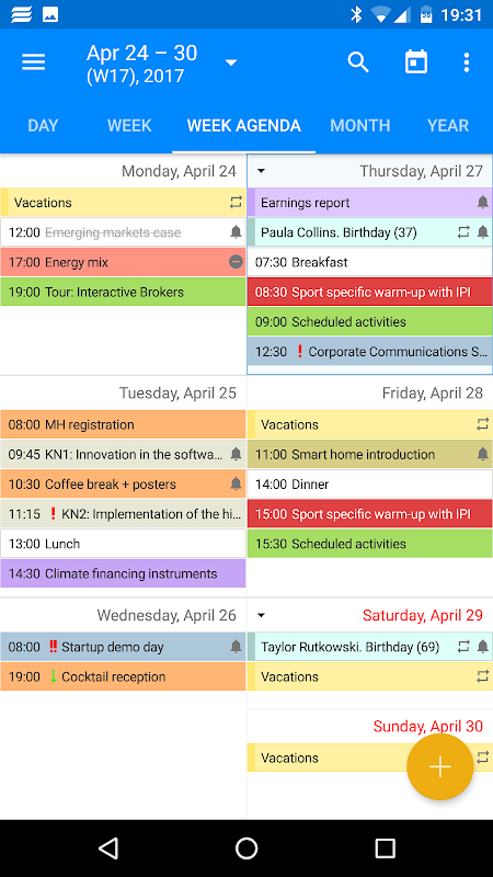 多彩且易读的日视图,周视图,月视图,年视图和议程视图。支持自定义类别。