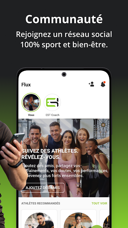 它不仅仅是一个应用程序,它还是一个很棒的社区,汇集了运动员,他们将通过我们的社交网络在每次训练期间为您提供支持!