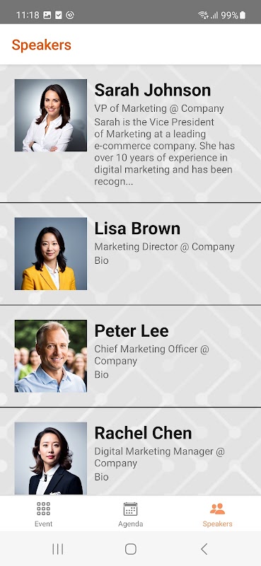使用 EventApper 应用程序,您将能够查看有关您的活动的所有信息,包括最新议程、发言人名单、地点、地址等内容。此外,您还可以选择可选的研讨会或传递您的偏好。