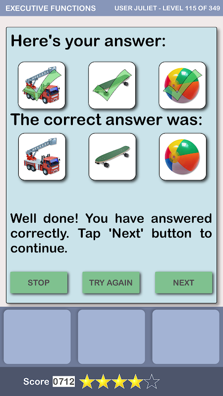 在每次练习的末尾,该应用程序都会显示获得的结果,并考虑相对难度,建议的要素数量,所花费的时间等来分配分数和评估。