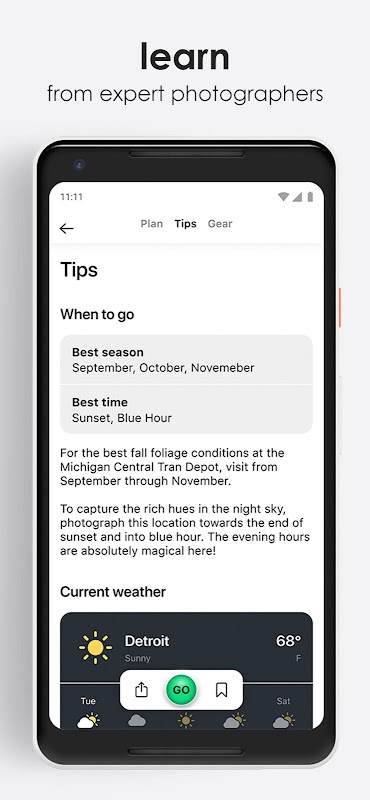 • 访问 Explorests 的现场提示和照片规格(相机、镜头、ISO、光圈、快门速度),这样您就会知道要带什么以及如何最好地捕捉完美时刻。