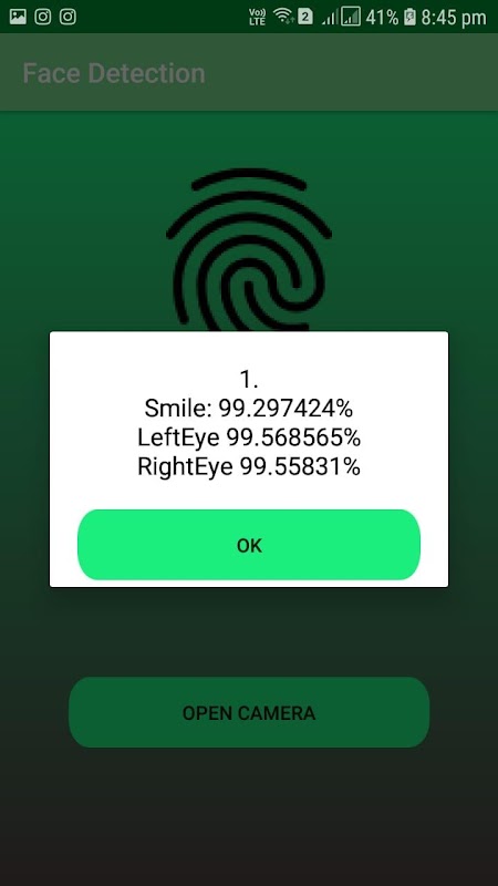 This is a simple application that uses google ML kit to detect the no of faces and smile probability, % of left eye opened and % of right eye opened from the face.