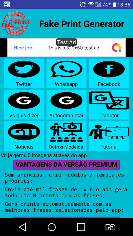 从顶级网站和社交网络创建虚假打印或虚假对话:Facebook,Whatsapp,Twitter,Google(建议),Google(自动填充),Google翻译,G1和背景图片。