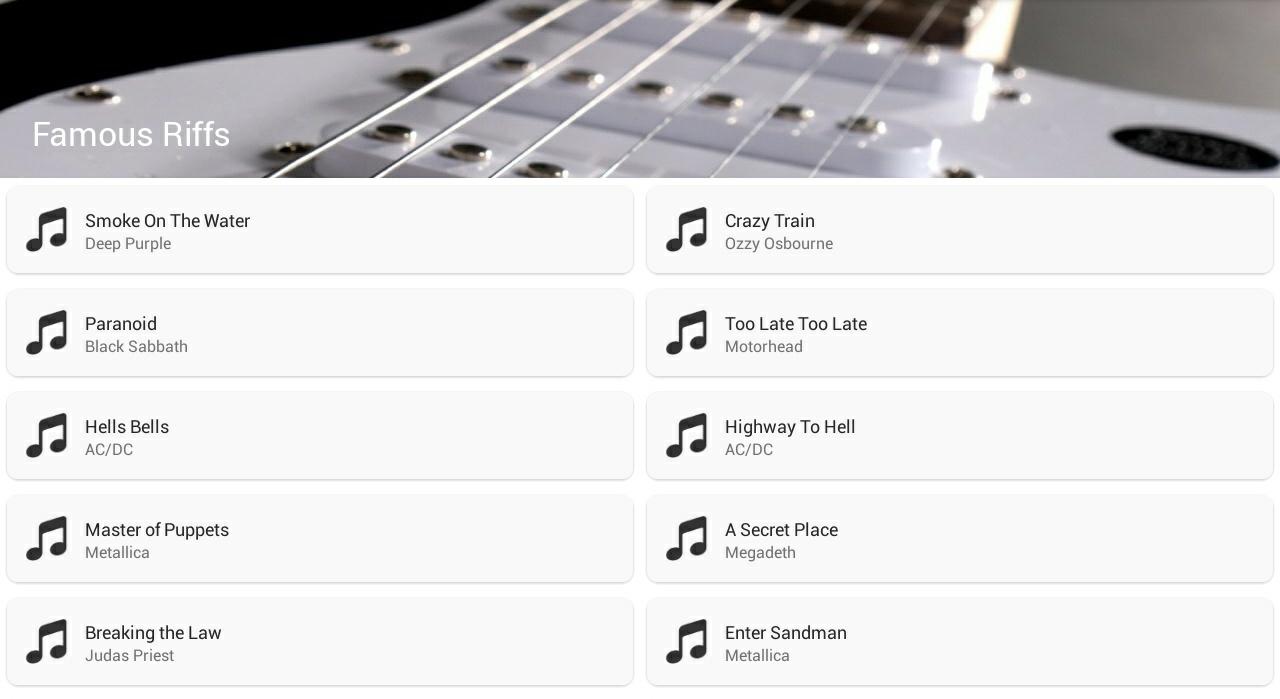 FamousRiffs是包含超过150个最优秀的岩石和金属吉他即兴的艺术家有AC / DC,Metallica的,Megadeth的,KISS,Judas Priest的,奥齐·奥斯本恩,蝎子等,这是非常适合初学者的吉他手,因为它包含了非常简单的免费应用程序即兴演奏。包含吉他riff tabulature和音频,以及歌曲的描述。