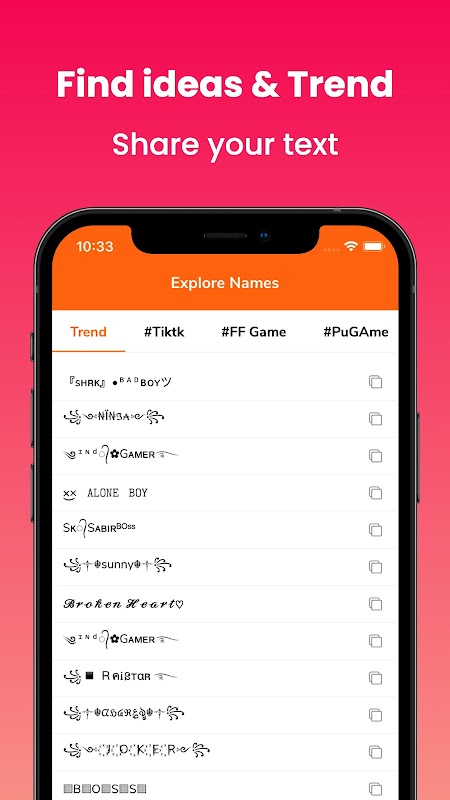对于玩 F Fire and Pub 的游戏玩家来说,该应用程序丰富的特殊字符和精美字体库可以轻松创建炫酷且令人难忘的游戏内昵称。无论您想在游戏中脱颖而出还是恐吓对手,该应用程序都能为您提供创建代表您的游戏风格的杀手昵称所需的一切。