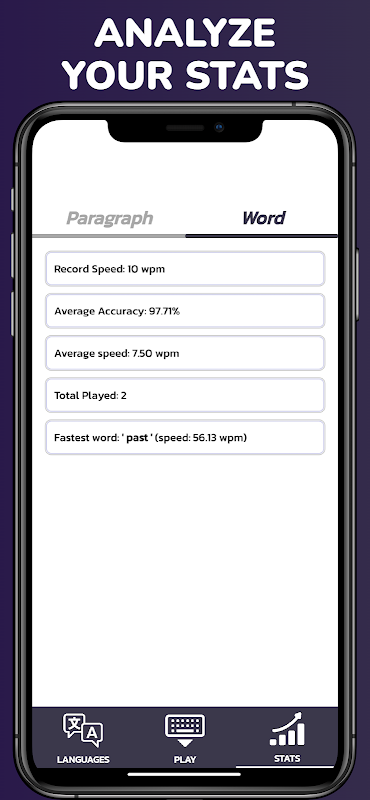 ● 即时查看您的 WPM(每分钟字数)得分和其他统计数据