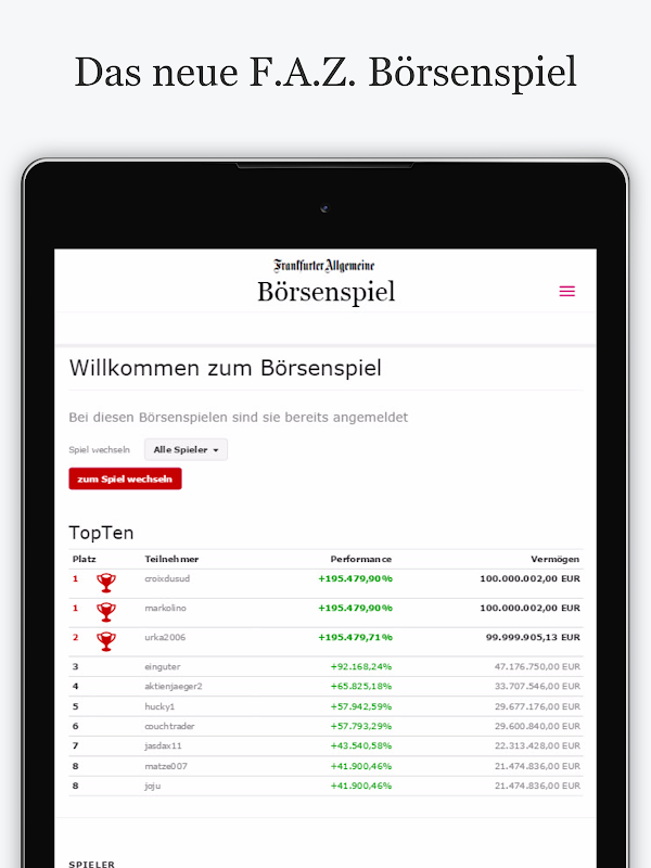 Spielen Sie Ihr eigenes Börsenspiel, laden Sie Freunde ein und messen sich untereinander im Kampf um die höchsten Kursgewinne.