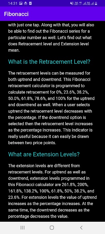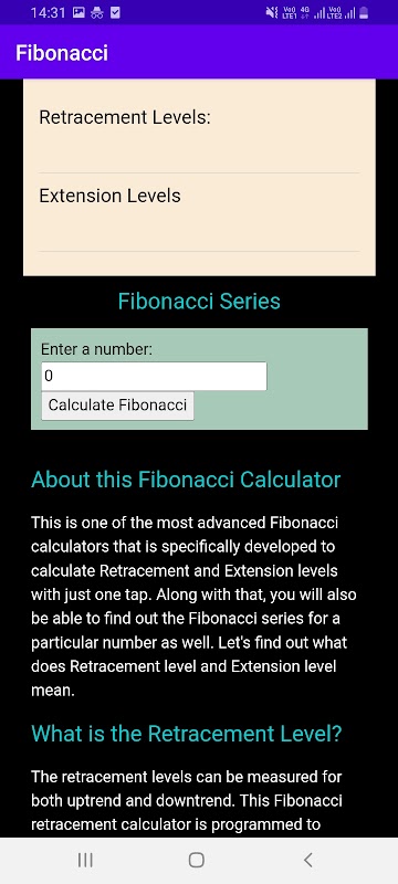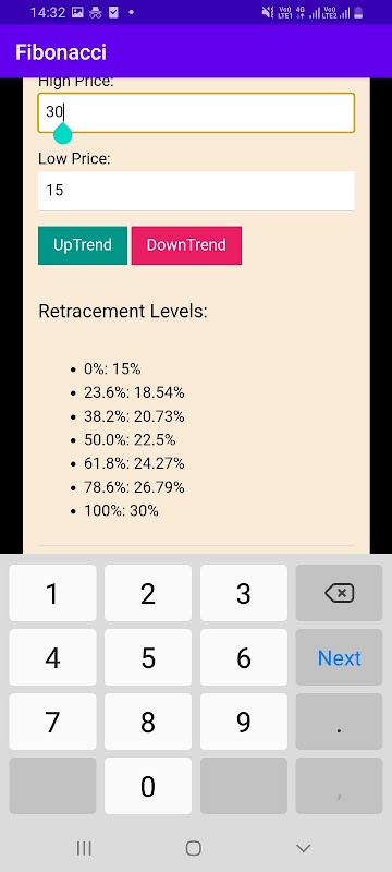 要使用这个斐波那契应用程序,您只需在文本区域内插入高价和低价,然后点击按钮即可。回撤答案有两种选择。第一个是上升趋势,第二个是下降趋势。