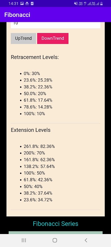 无论您想要计算斐波那契回撤或扩展的选项,您只需点击按钮即可。一旦您点击上升趋势或下降趋势按钮,斐波那契计算器就会相应地显示答案。