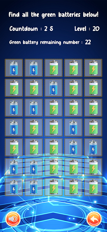 游戏由35张电池卡组成,分布在7行5列。游戏开始后,你需要在倒计时3秒内记住所有绿色电池的位置。之后所有电池卡都会被锁定。在倒计时20秒内点击电池卡。点击蓝色电池卡后游戏结束。找到所有绿色电池,即可进入下一关。随着关卡数量的增加,绿色电池的数量也会增加。游戏倒计时、关卡级别以及剩余的绿色电池数量会显示在屏幕顶部。