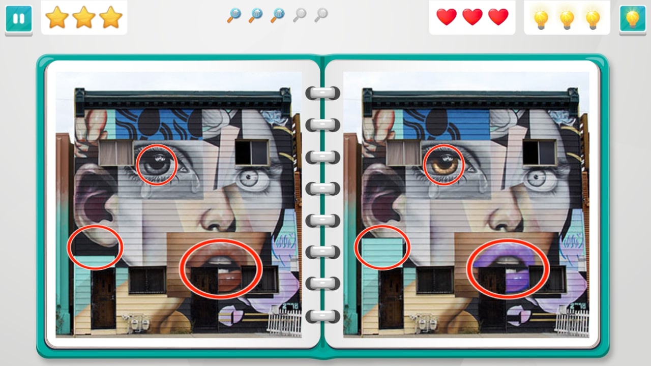 注意图片中的所有差异,在不使用任何线索的情况下找到它们以获取所有星星,发现所有游戏模式并解锁所有级别。