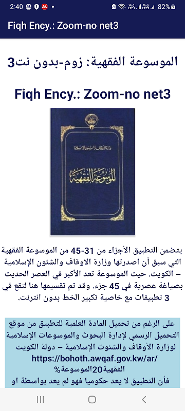 该应用程序不是由科威特国政府或代表科威特国政府开发的。使用的材料保持原样,没有改变。仅百科全书部分内容的索引已添加到应用程序中。该申请包括科威特国宗教基金和伊斯兰事务部发布的宗教基金百科全书的第 31 至 45 部分,共 45 个部分。它在这里被分为3个部分(应用程序),具有无需互联网即可放大字体的功能。隐私政策载于: