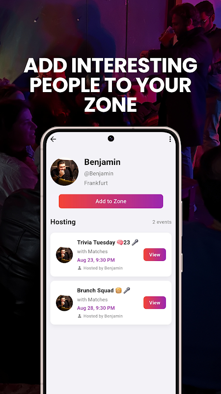 我们的人工智能系统会根据您的个性、氛围和生活方式为您匹配——而且您参加的聚会越多,系统就会越智能。您将受邀与您真正想认识的人一起体验真实的生活。