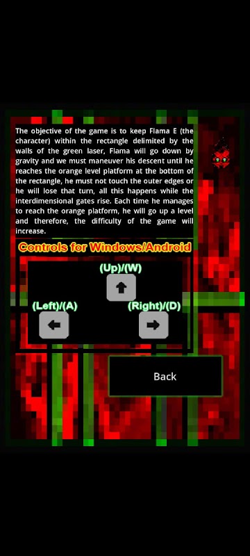 游戏的目标是操控 Flame-E(角色)到达下方的橙色平台,到达后即可进入下一关。随着关卡的推进,难度也会随之增加。玩家不得触碰矩形激光墙,否则将输掉游戏并重新开始下一关。这是一款消磨时间、缓解日常生活压力的游戏。游戏中物体的移动具有一定的随机性,这意味着关卡内容并非一成不变。