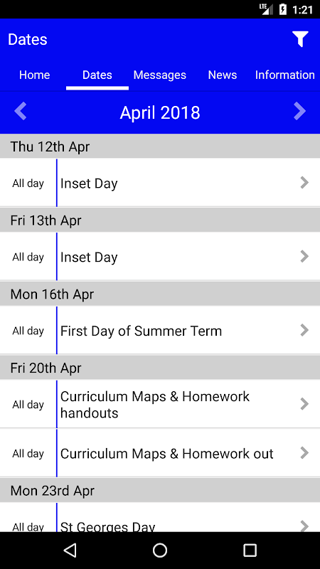 Shows all the latest stories from your school or organisation. If you tap on any news item you will be able to see more detail.