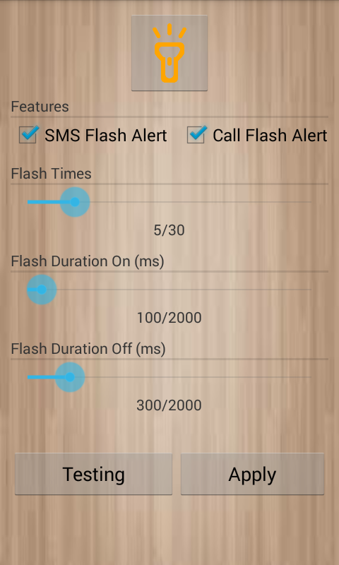 This application will flashing flashlight to alert user when receive an incoming call or SMS