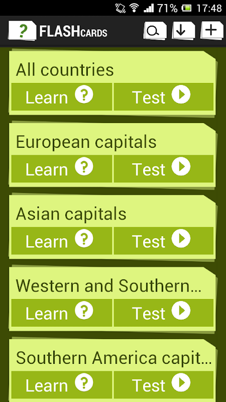 Apart from learning capitals, you can use our app for studies: language and math learning, etc. Create as many flashcards as you want: just type a question and an answer. Also, you can import an existing file and use it with a help of our app.