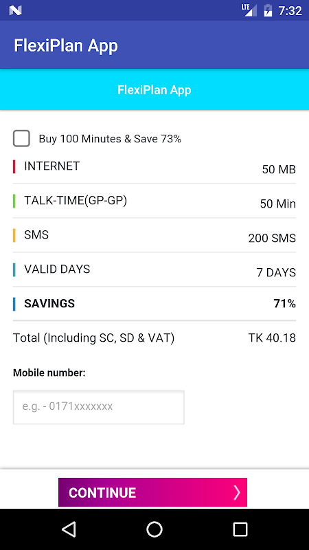 FlexiPlan应用是一款免费应用程序,你可以购买Grameenphone公司MB,通话时间和短信。