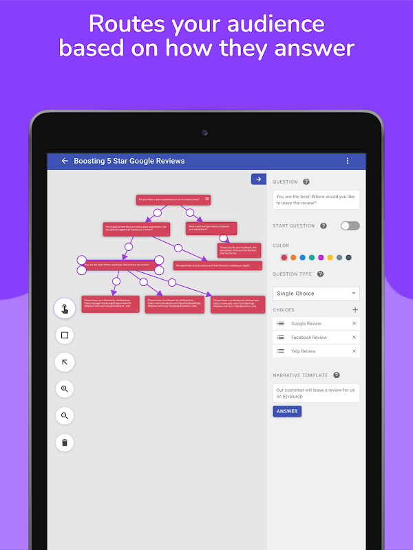 借助 FlowCharts.ai,我们开发了一个智能的动态和交互式漏斗引擎,您可以在其中添加自己的问题,并让您的受访者根据他们对您问题的回答神奇地通过您的流程图和工作流程进行路由和漏斗。您可以将其视为“思维导图”或“跳过逻辑”:如果 x 为真,则显示 y。设计完美的调查、表格或工作流程。在几秒钟内部署到您的受众,实时收集数据并帮助您实现目标和需求。