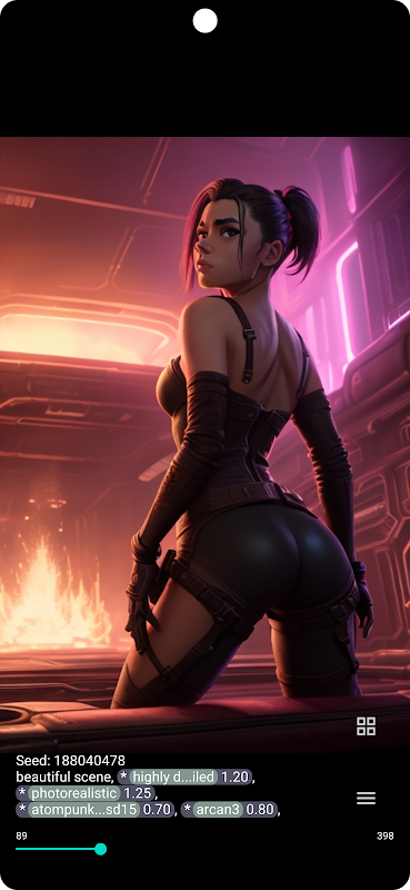 你得到的是 AI 生成图像的连续流。只需向右滚动即可获取新的,向左滚动即可访问历史记录。您可以修改提示和设置并命令它生成新的(使用另一个种子)或再次生成(使用相同的种子)。