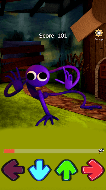 在FNF紫彩虹角色测试游戏中,您可以测试主角的动作和声音。 为此,请单击设备屏幕上的箭头。 在这种情况下,英雄会做出一定的动作并发出声音,你就会获得积分。