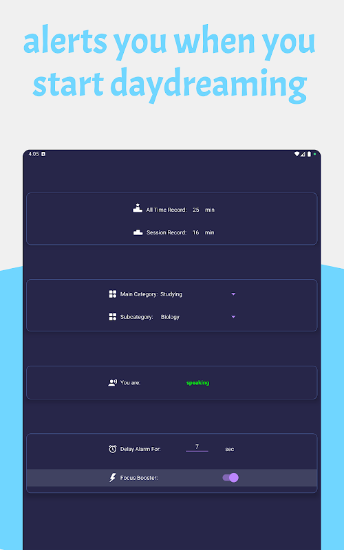 • 保持警觉:应用会监控你的活动。如果你停止说话,Focusability 会检测到这种情况并发出警报。