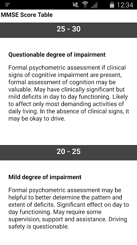 Mini–Mental State Examination (MMSE) or Folstein test is a 30-point questionnaire used extensively in clinical and research settings to measure cognitive impairment. It is commonly used in medicine and allied health to screen for dementia. Please be advised this mobile app is to facilitate healthcare professionals on the go. Ensure the MMSE is administered once to deter implicit priming and duplicate response errors.