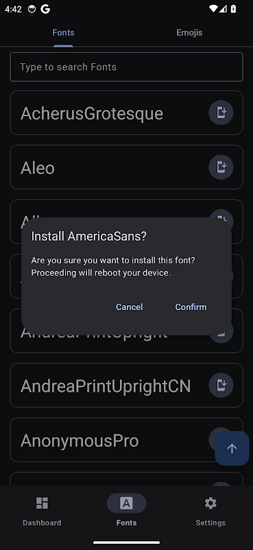 Androidacy 的字体管理器是一款可让您预览和安装字体等的应用程序。