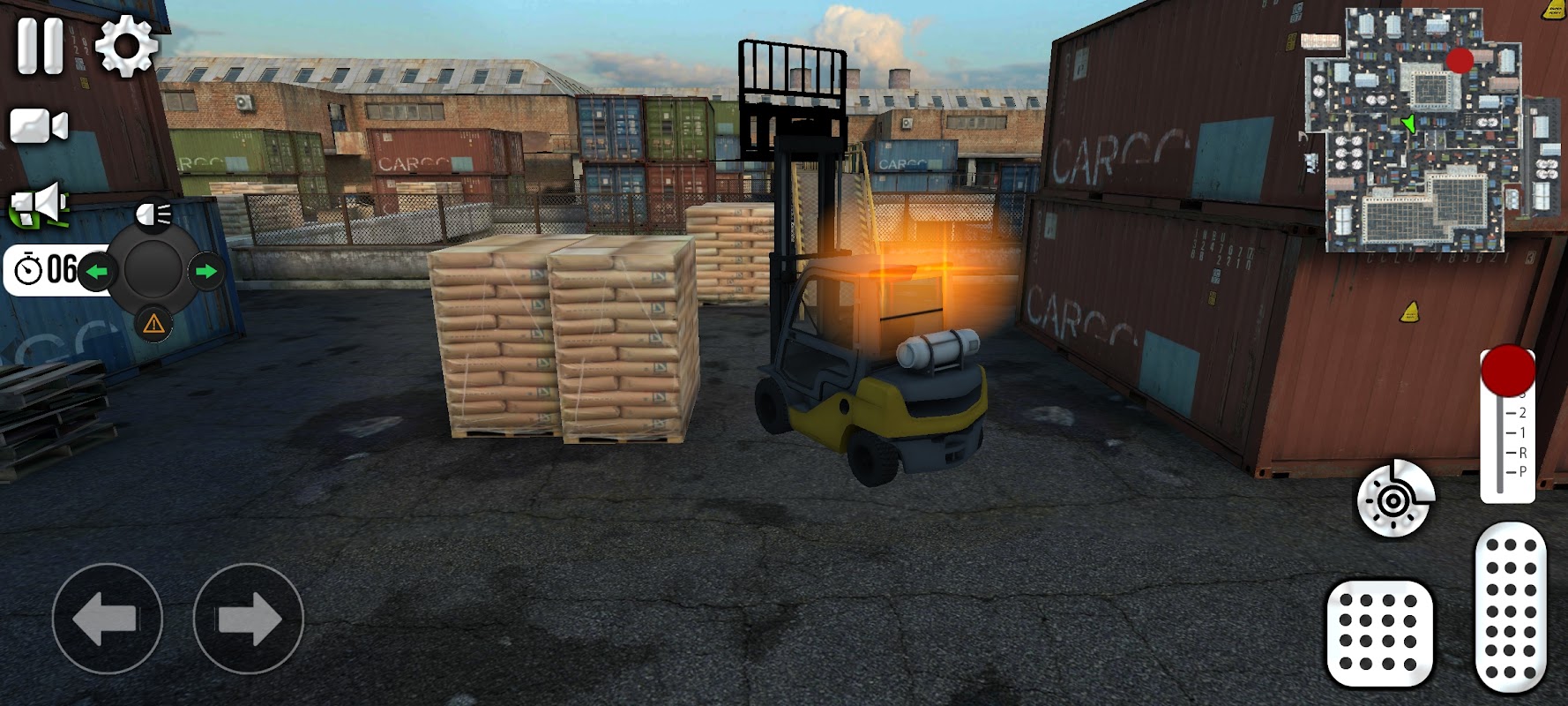 The forklift has real physics features. You can control the front panel of the forklift with the buttons.