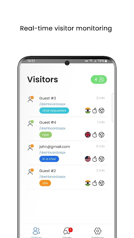 实时访客监控:Formilla Live Chat应用程序将自动显示和更新您的Android设备上当前在您网站上的活跃访客数量。与用户发起实时聊天,查看他们访问过的网页,引荐网站URL,他们是新用户还是返回用户等.Formilla Live Chat访客监控附带我们的任何高级帐户包。