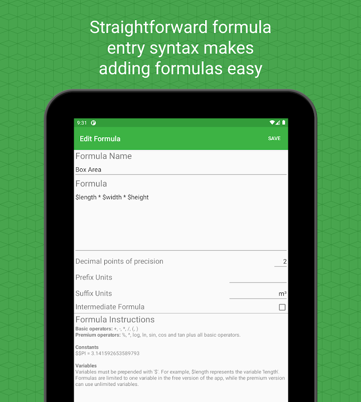 FormulaPro是一个自定义公式计算器。您输入公式和值,应用程序将进行计算!将公式分组在一起以在多个公式之间共享变量值。