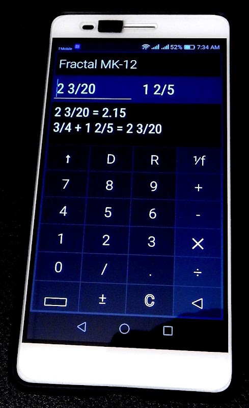 Fractions Calculator "Fractal MK-12" and MK-12P" (the latest Professional Edition) works on Regular (e.g. 2/3) and Improper (e.g. 4/3) Fractions, Mixed numbers (e.g. 1 /3/4), Decimals (e.g. 3.14) and Whole (like 12345) up to 10-digit length. It performs four standard Arithmetic operations (Add "+", Subtract "-", Multiply "x" and Divide "÷") and multiple function calculations:
