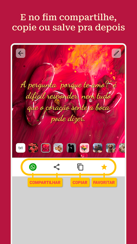 使用非常简单,只需选择其中一个爱情短语并在任何您想要的地方分享:在对话中、在 WhatsApp 状态中、在故事中或在短信中。如果您愿意,您可以在发送之前编辑该短语,为其赋予特殊的感觉,例如输入您的名字或您所爱的人的名字,还可以添加爱的背景图像以图像格式分享。