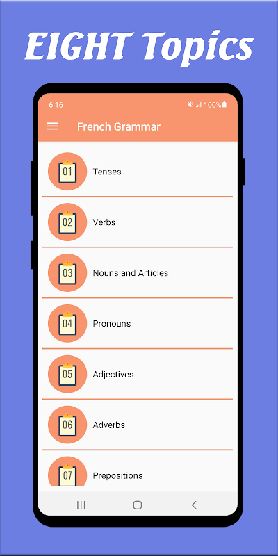 该应用程序的设计和开发是为了促进法语语法的学习。通过此应用程序,您可以免费学习法语,包含 8 个主要主题的 50 多个课程。