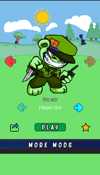 在星期五有趣的 Flippy Mod 测试中,您将扮演一个名为 Flippy 的英雄。这个角色是流行卡通快乐树朋友中的一只熊。从本质上讲,Flippy 友好而冷静。他看起来像一只穿着迷彩制服的可爱的绿熊。他的头上戴着军用贝雷帽。这很有趣,但他似乎不穿裤子走路:) 然而,一旦这只友好的熊听到某些声音,它就会变得疯狂和非常残忍。战争时期的记忆让 Flippy 做了可怕的事情。在这种状态下,还是不要挡他的路为好。在星期五搞笑 Flippy Mod 测试中,您可以选择您最喜欢的英雄状态。