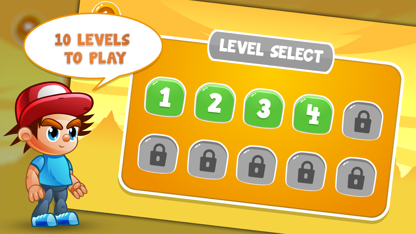 Take control of our fun boy try to keep him out of danger, You have to use every opportunity to not become a victim. Run along the rocky platforms, overcome obstacles and enemies, collect coins, earn points and compare them with the points of other players.