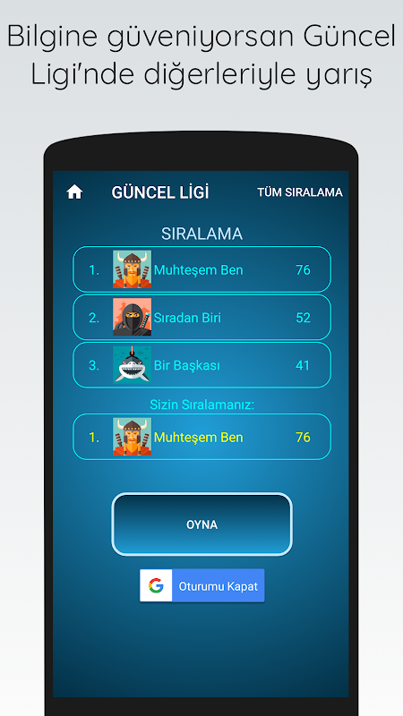 Kullanıcılar en iyi puanlarına göre günlük, haftalık ve tüm zamanları içeren bir lider tablosunda sıralanırlar.