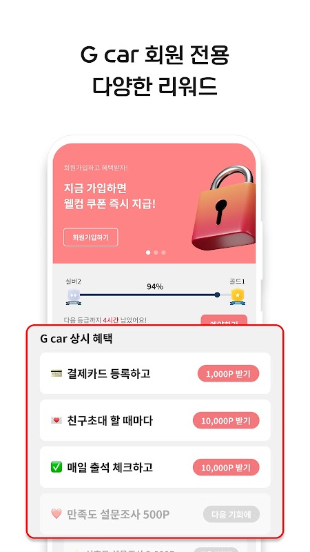 只需一个 G car 应用,即可在 1 分钟内完成从注册、预订到使用的所有流程!- 3 分钟内即可租赁小型车、SUV 和电动汽车,每次租赁以 10 分钟为单位。- 每周至少一次的洗车管理以及各种安全选项,确保安全租赁。- 实时查看租赁车辆的清洁度和保养状况。